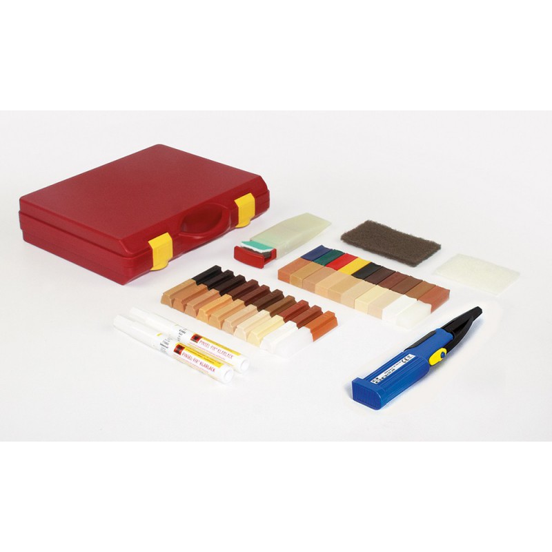 Profesionální servisní kufřík pro opravu škrábanců, malých otvorů, prasklin, vrypů, promáčklin, špatně ořezaných hran za pomocí měkký voskových tmelů. Set je vhodný také k opravám středních poškození jako jsou hlubší rýhy, ulámané hrany, špatně navrtané otvory za pomocí tvrdých tavných voskových tmelů. Součástí kufru je profesionální plynová pájka s regulací teploty, speciální plastová špachtle-hoblík na zarovnání a modelování voskových tmelů. Pro závěrečné překrytí a fixaci opravy slouží bezbarvý lak ve fixu.