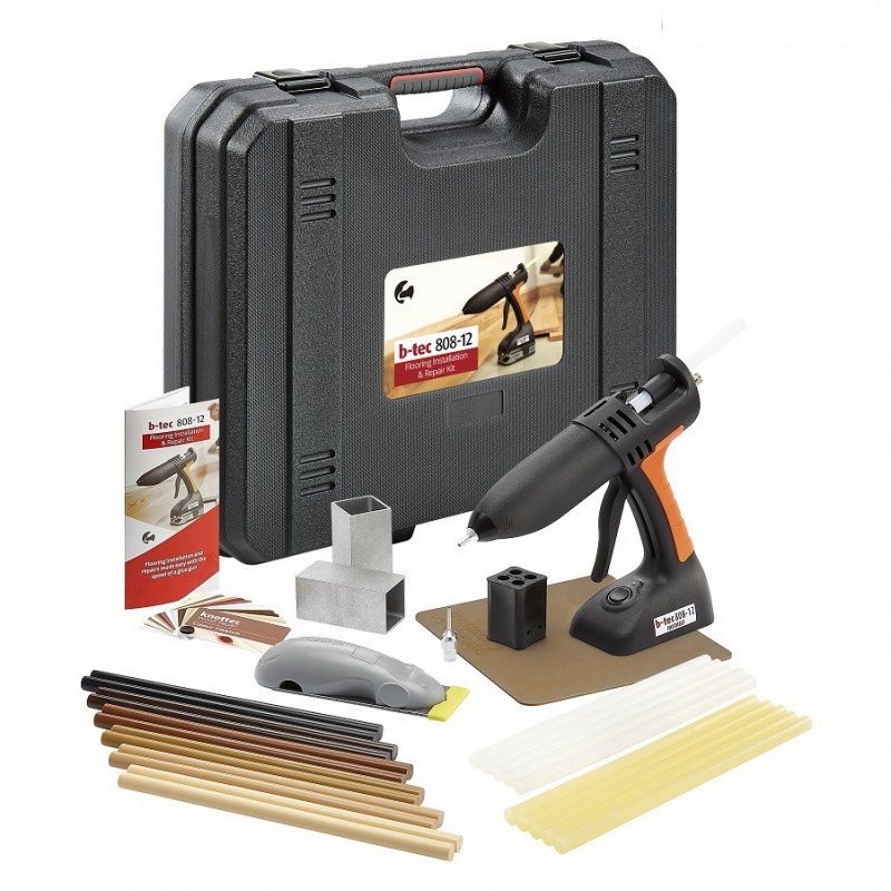 Profesionálný servisný kufor Knottec® 808B pre opravy hrčí, škár, prasklín a ďalších vád v masívnom dreve a dyhe s tavnou pištoľou na akumulátorovú batériu RYOBI® ONE + 18V alebo s adaptérmi na akumulátory 18V od značiek Bosch Professional, Makita, DeWalt alebo Milwaukee. Servisný kufor neobsahuje batérie, nabíjačky ani adaptétry, ktoré možno inak kúpiť podľa preferenciu samostatne.