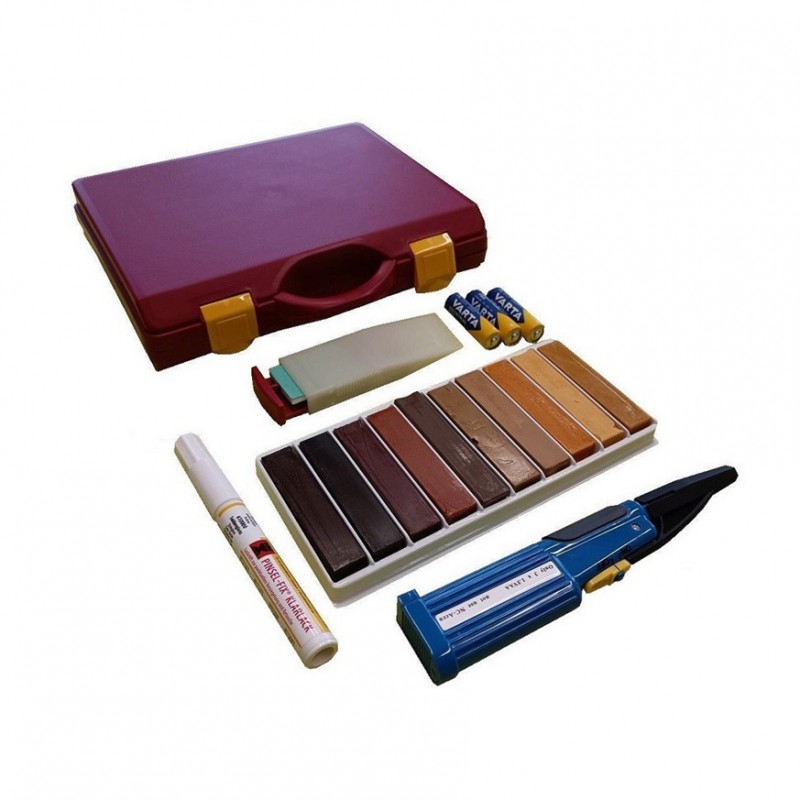 Základný profesionálny set pre opravu vrypov, dier, rýh, malých otvorov, promáčklin a poškodených hrán. Set je vhodný na drevené lakovaná okná lazúrami alebo ostatnými laky na okná. Set obsahuje 10 ks tvrdých voskových tmelov Plus (rôzne odtiene lazúr eurookien) pre vyplnenie poškodenia, ktoré sú vhodné pre vnútorné i vonkajšie použitie a všetky potrebné nástroje pre vykonanie opravy. Pre fixáciu opravy slúži bezfarebný lak vo fixu sa štetcovým hrotom Pinsel-Fix v hodvábnom lesku.