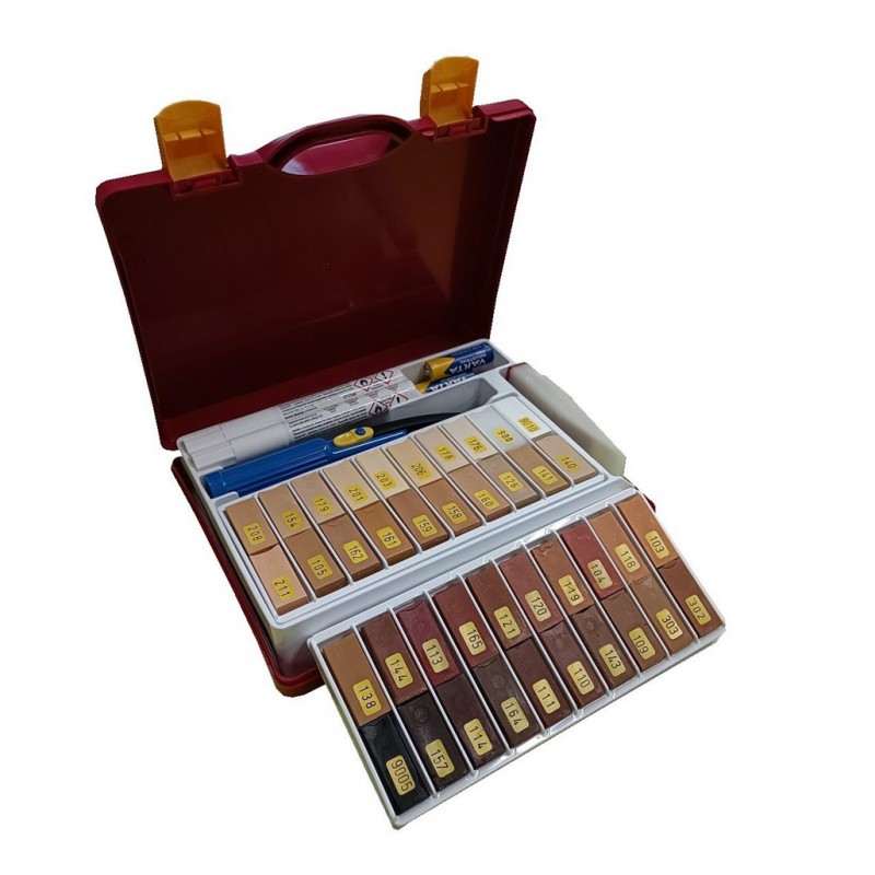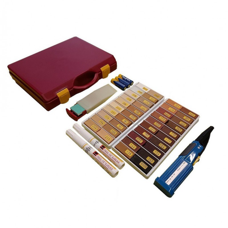 Základný profesionálny set pre občasné opravy vrypov, škrabancov, malých otvorov, zárezov a poškodených hrán vzniknutých pri výrobe, montáži, transporte alebo používaním. Set je vhodný na drevené lakované a umelé plávajúce podlahy, parkety, nábytok, schodnice, dvere a kuchynský nábytok a pracovné dosky. Set obsahuje 40 ks tvrdý voskových tmelov (rôzne odtiene dreva, biela, čierna) na vyplnenie poškodenia, tavnú spájku na ceruzkový batériič a všetky potrebné nástroje na vykonanie opravy. Na fixáciu opravy slúži bezfarebný lak vo fixke so štetcovým hrotom Pinsel-Fix. V kufríku sú dva kusy v stupňoch lesku: hodvábny lesk a mat. Do setu je možné dokupovať náhradné a ďalšie odtiene tvrdých voskových tmelov a fixky v ďalších stupňoch lesku.