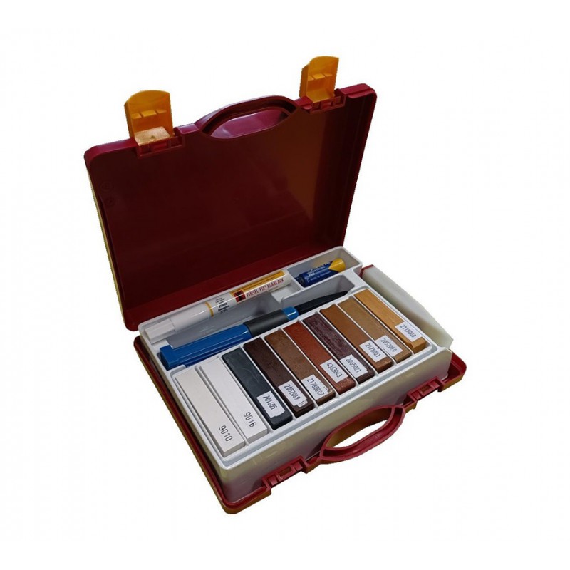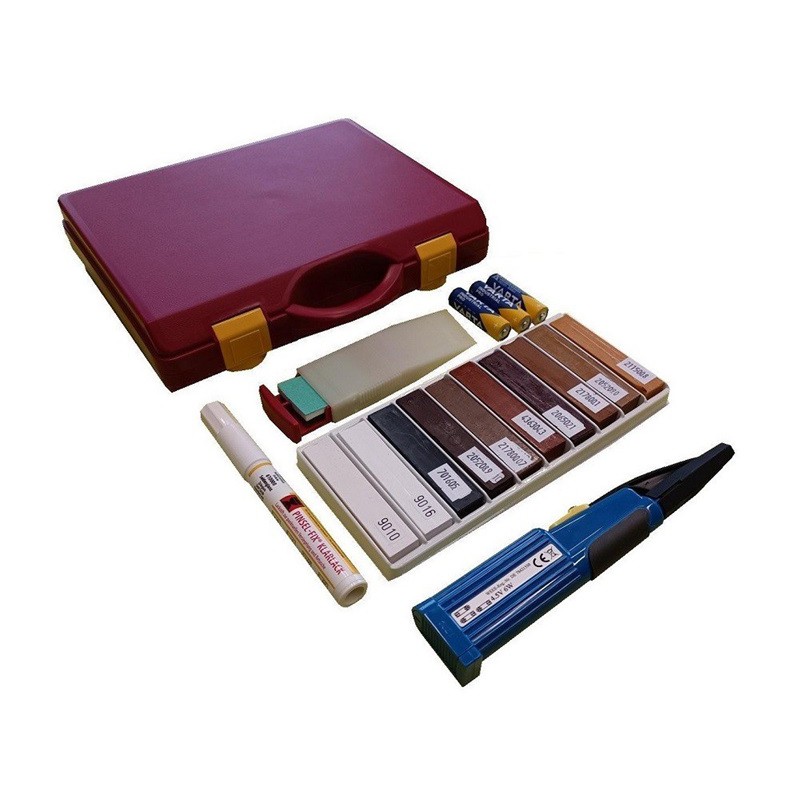 Základný profesionálny set na opravu vrypov, dier, malých otvorov, zárezov a poškodených hrán. Set je vhodný na biele PVC alebo farebné okenné kašírovacie fólie. Set obsahuje 10 ks tvrdých voskových tmelov Plus (biela + rôzne odtiene okenných fólií) na vyplnenie poškodenia, ktoré sú vhodné na vnútorné i vonkajšie použitie a všetky potrebné nástroje na vykonanie opravy. Na fixáciu opravy slúži bezfarebný lak vo fixke so štetcovým hrotom Pinsel-Fix v hodvábnom lesku.