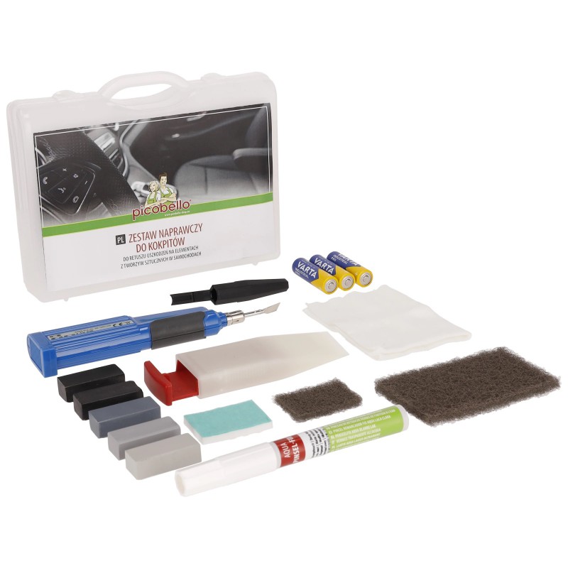 Optimálny základný set pre opravu dier, vrypov, starých montážnych otvorov, trhlín a poškodených hrán. Set je vhodný pre opravy umelých, koženkových a kožených povrchov interiérov automobilov, karavanov, autobusov a vlakov. Set obsahuje tavné tmely, spájku a ďalší doplnkový materiál na vykonanie dokonalé opravy. Pre fixáciu opravy slúži bezfarebný lak vo fixu sa štetcovým hrotom.